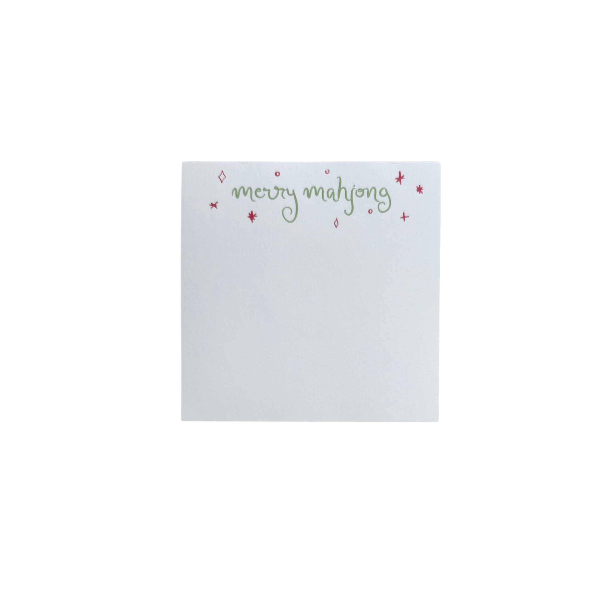 Holiday cheer meets your favorite game. These festive square notepads feature a playful hand-lettered design with whimsical mahjong-inspired details scattered about.